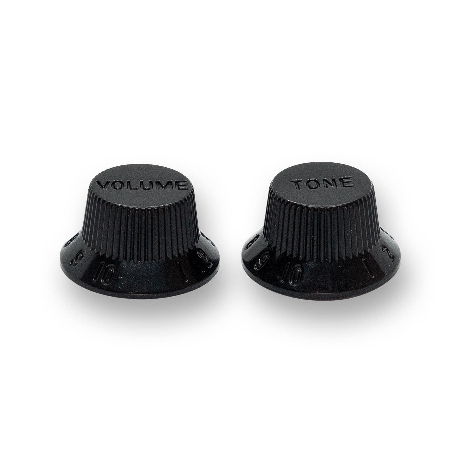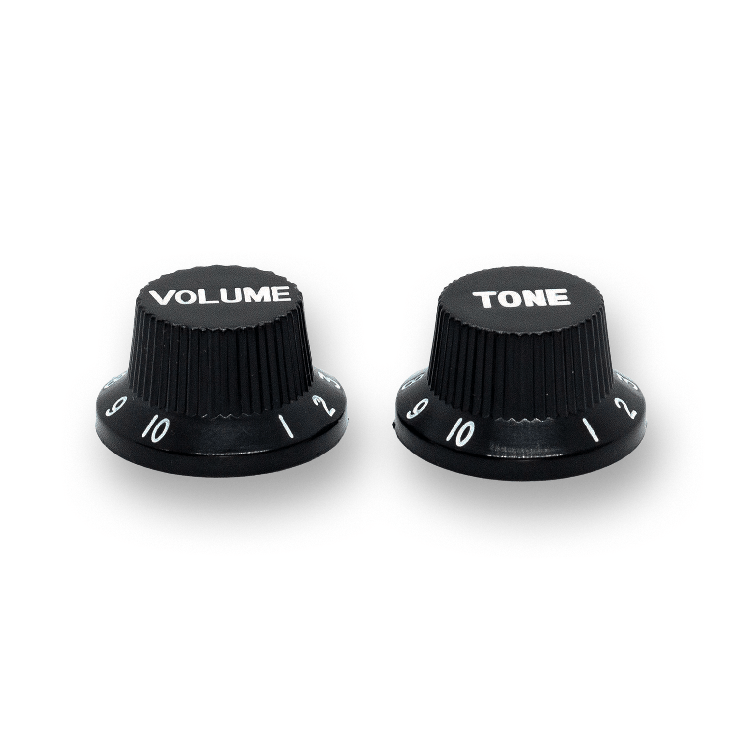 Various Stratocaster Style Top Hat Pot Knobs with Volume and Tone written on top.